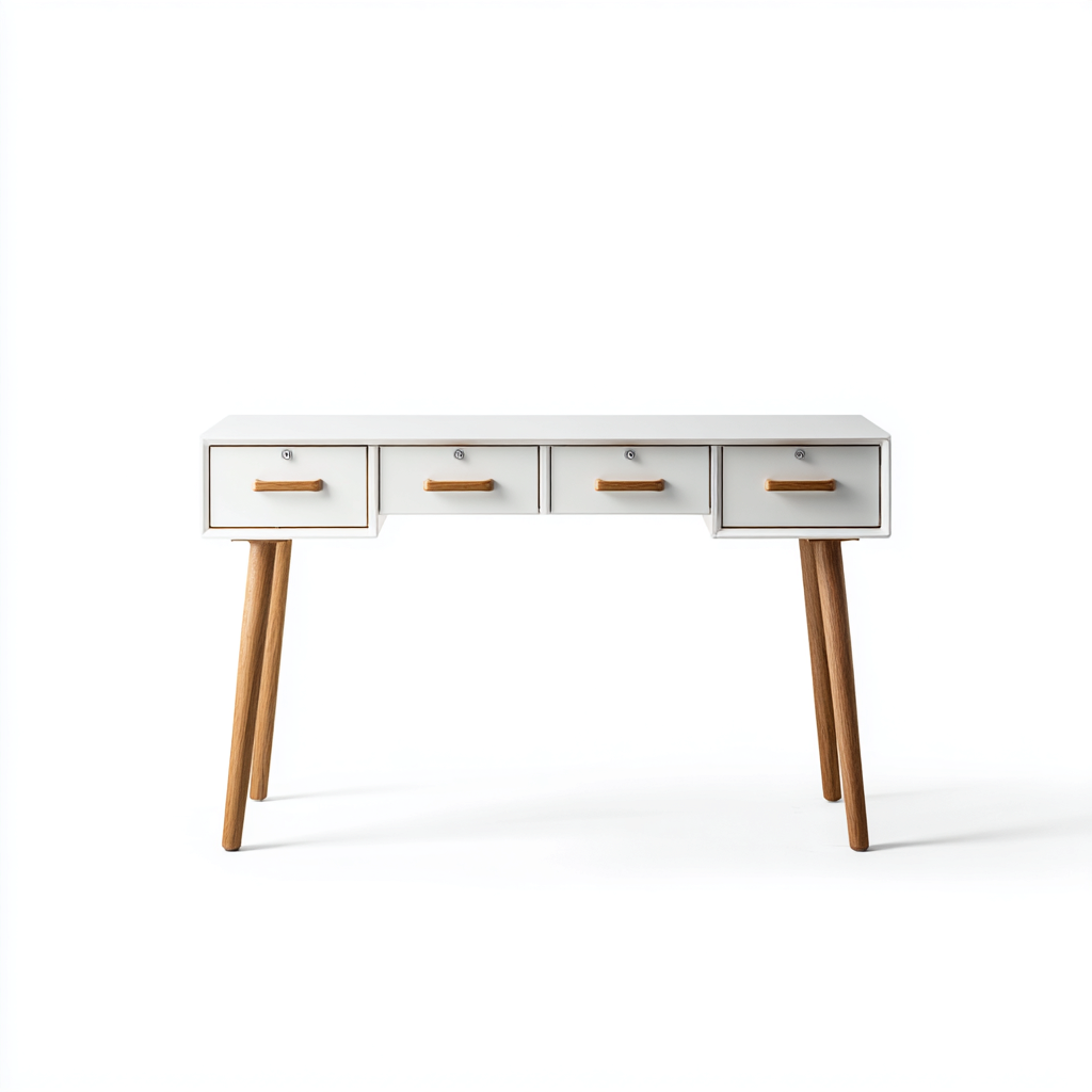 Struttura realizzata in legno con piano e cassetti di colore bianco e gambe in legno naturale. Le superfici sono rifinite con attenzione per garantire stabilita strutturale, resistenza all'uso quotidiano e una resa estetica equilibrata.